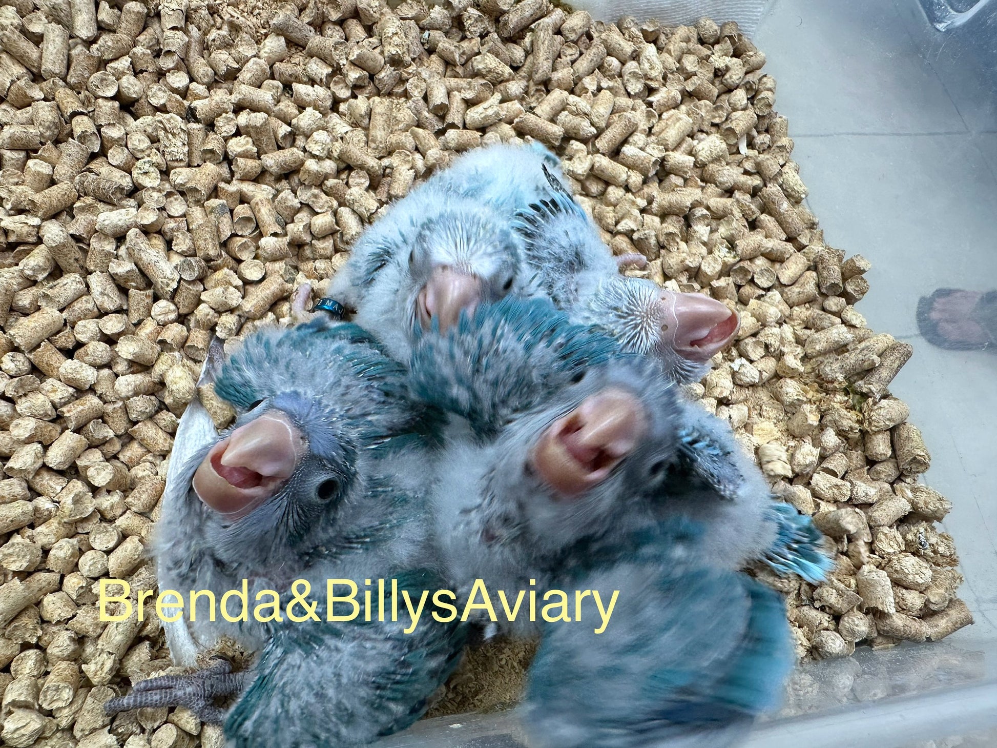 Blue and Blue Opaline baby Quakers. Snuggly little babies, fun and super smart.
