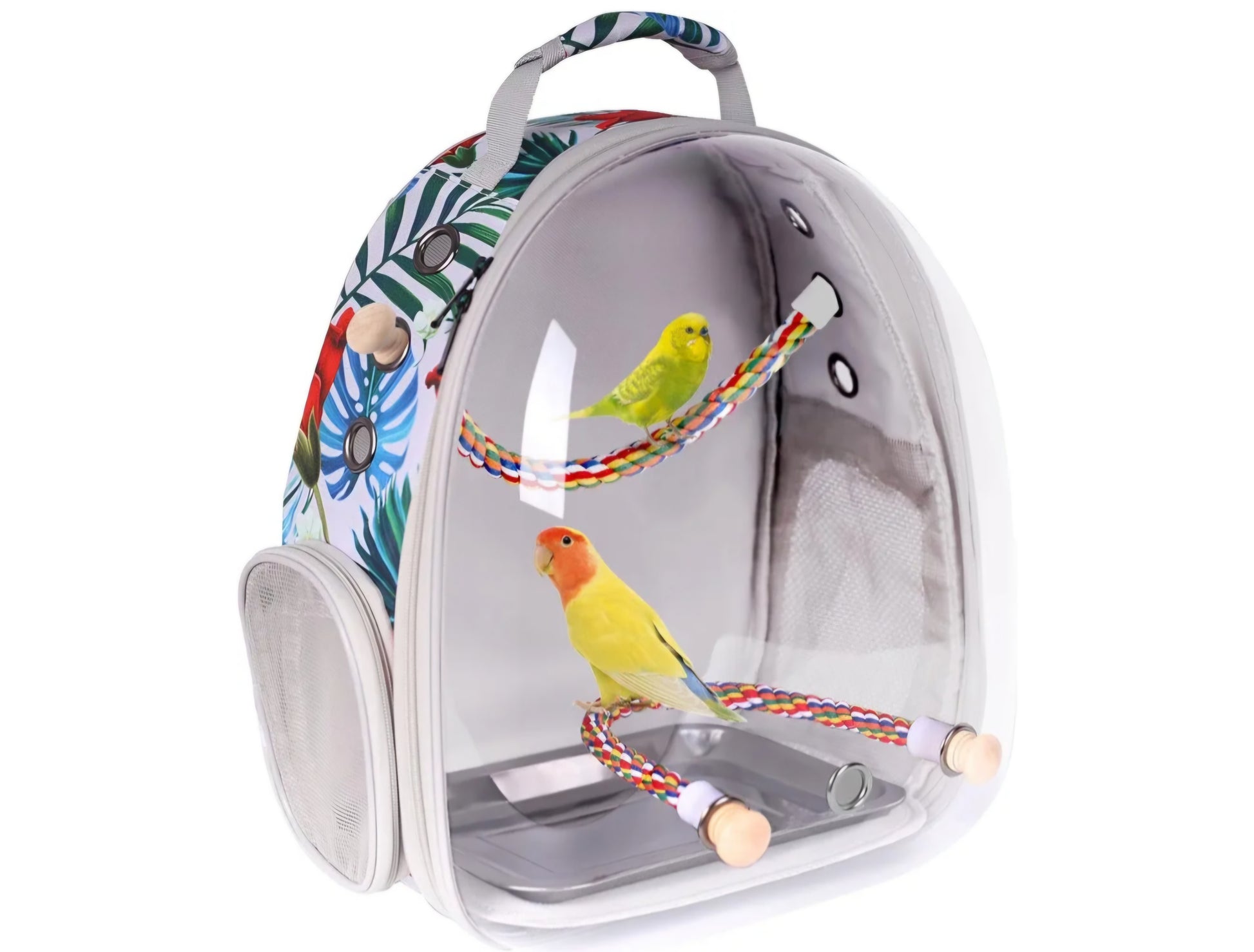 Bird Traval Carrier Cage, Clear Space Capsule Astronaut Backpack to Carry Parakeet Cockatiel Parrot with Metal Tray Wood Perch, Vet Transport School Bag